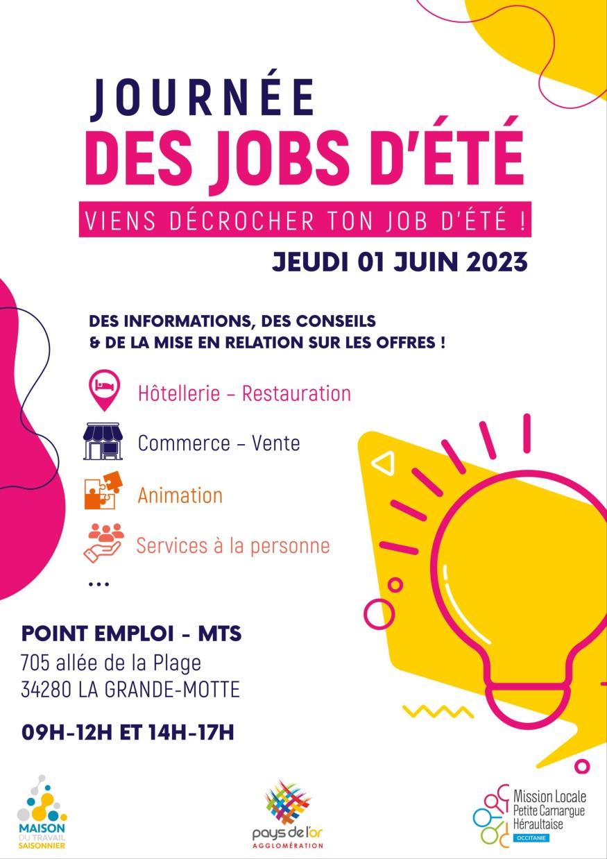 Jeudi 1er juin de 9 h à 12 h et de 14 h à 17 h, le service Emploi de l’agglomération du Pays de l’Or, en partenariat avec la Mission locale jeunes de La Petite Camargue Héraultaise organisent la « Journée des jobs d’été » dans les locaux du Point emploi de La Grande-Motte. Une opportunité donnée aux jeunes en recherche d’emploi saisonnier et de premier emploi.