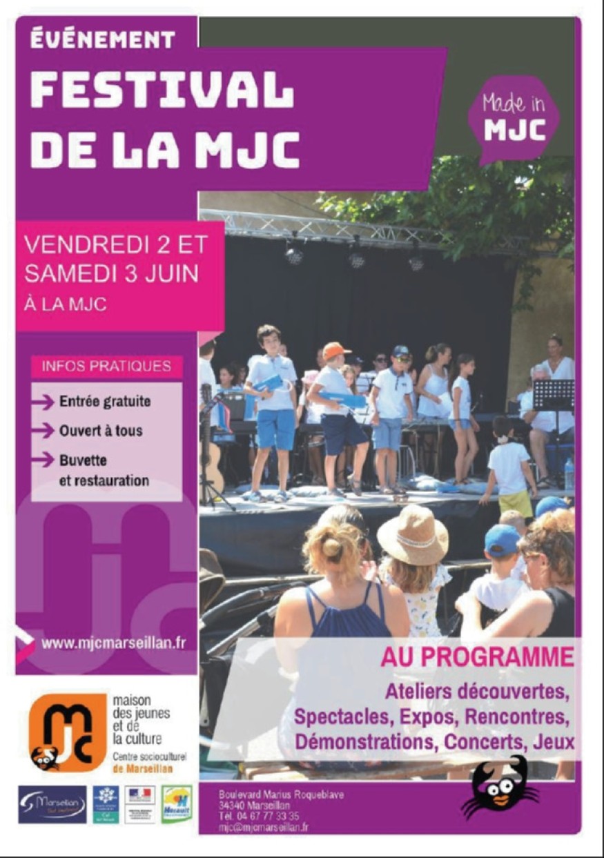 La MJC de Marseillan organise son Festival vendredi 2 et samedi 3 juin. Cet évènement ouvert à tous est l’occasion de présenter les différentes activités proposées par l’association, dans une ambiance festive. Musique, danse, sport, bien être, jeux, loisirs créatifs, il y en aura pour tous les goûts. La Maison des Jeunes et de la Culture de Marseillan ouvre grande ses portes à tous les habitants de notre ville et bien au-delà. Vendredi 2 juin à partir de 19h et samedi 3 juin de 9h30 à 18h, les animateurs et adhérents de la MJC présenteront un feu d’artifice de leurs pratiques amateurs dans tous les domaines. Ainsi, un tourbillon de danses, de sports, de chants, de musiques, de théâtre, d’arts manuels, de techniques d’expressions et de bien-être, se répandra joyeusement dans la Maison des Associations. Durant toute la durée de ce festival, les participants trouveront à se restaurer et se désaltérer.