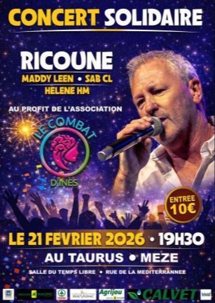 Le vendredi 21 février 2026 à 19h30, la Salle du Taurus à Mèze accueillera un concert solidaire exceptionnel avec Ricoune, artiste incontournable et emblématique des soirées festives du Sud.
