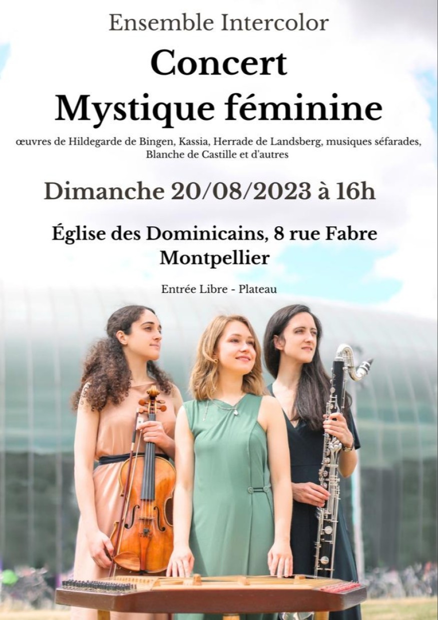 Concert par un trio féminin virtuose, d’œuvres féminines "mystiques" depuis le 9e siècle jusqu'à nos jours, notamment de la célèbre Hildegarde de Bingen, Blanche de Castille, sur des poèmes de Marie Noël, et bien d'autres.