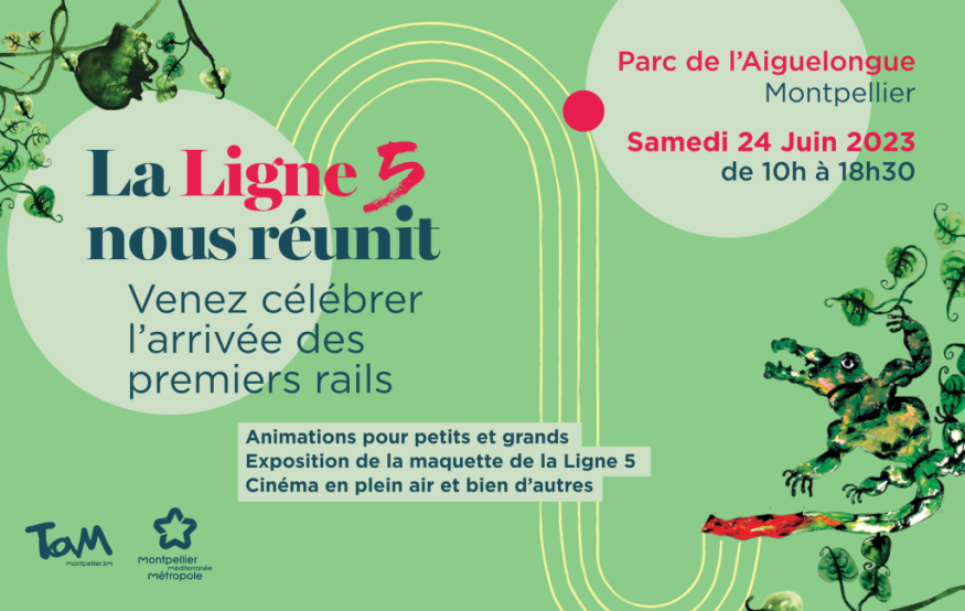 Le samedi 24 juin la Ligne 5 nous réunit ! Venez célébrez l’arrivée des premiers rails au Parc de l’Aiguelongue à Montpellier, de 10h à 18H30.