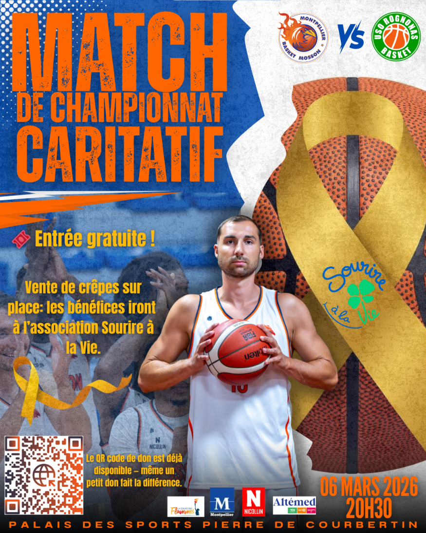 Vendredi 6 mars à 20 h 30, le Montpellier Basket Mosson recevra Rognonas en championnat de Nationale 2. Une rencontre sportive qui prendra une dimension solidaire, placée sous le signe de la sensibilisation au cancer pédiatrique, avec la participation de l’association Sourire à la Vie.