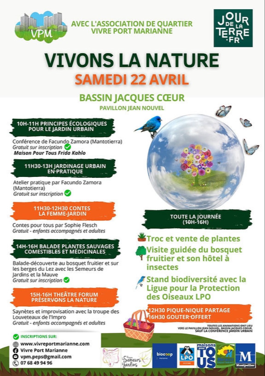 L’association de quartier Vivre Port Marianne invite à célébrer le Jour de la Terre 2023, ce samedi 22 avril. Cette journée sera ponctuée d’animations pour petits et grands. stand de vente de plantes cultivées par les élèves du lycée agricole de Castelnau-le-Lez : plantes aromatiques, potagères, d’ornement, un troc de plantes sera également organisé. Apportez vos plants, semis ou graines soigneusement étiquetés et repartez avec les productions d’autres jardiniers.