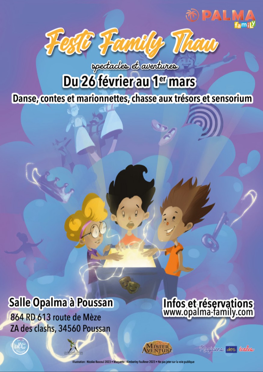Du Dimanche 26 février au mercredi 1 mars OPalma Poussan propose divers spectacles pour enfants dès la maternelle , Marionnettes, Contes, Spectacle musical, espace Game chasse aux trésors, miracle du sensorium…Tarifs 8€