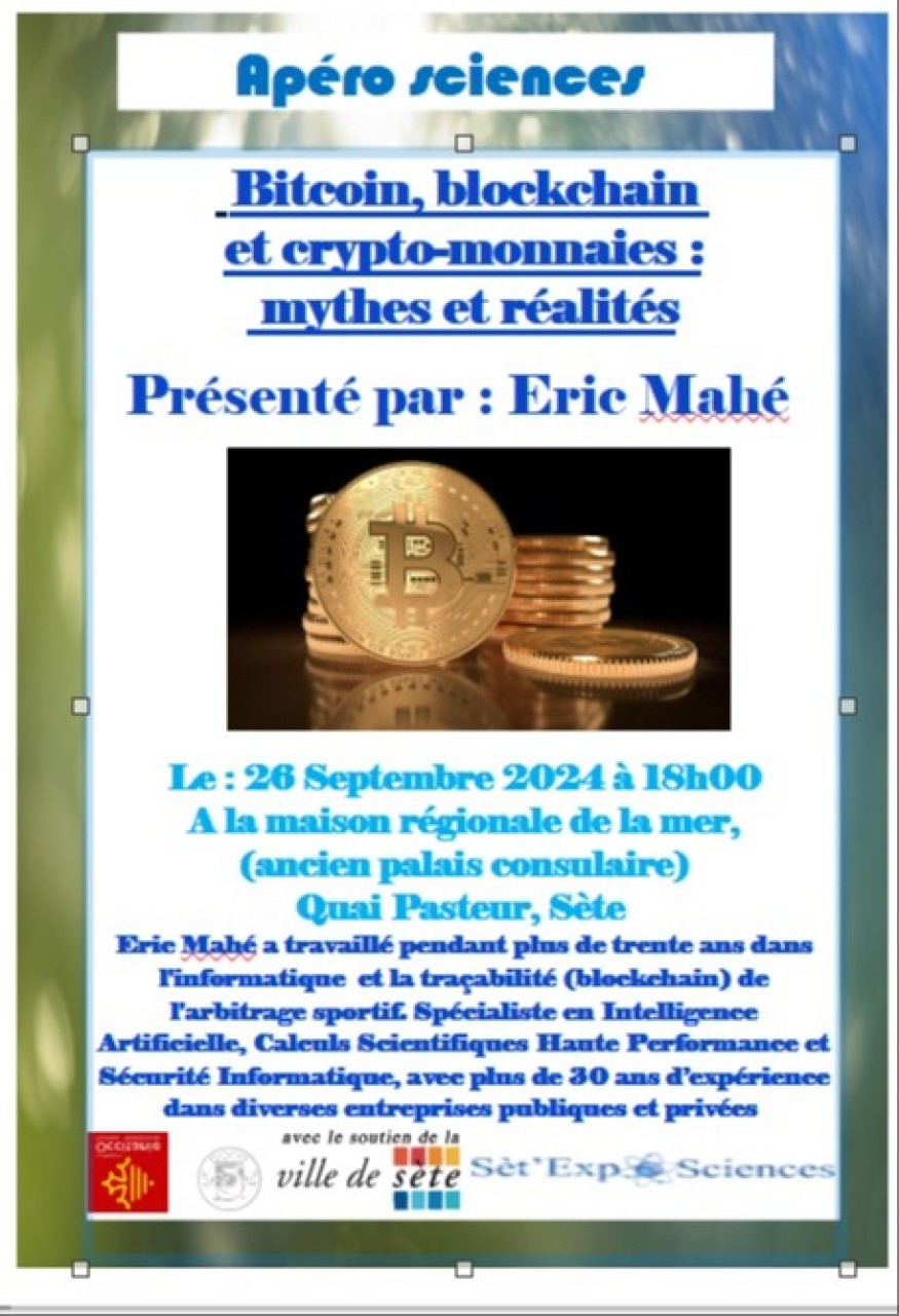 C'est la rentrée pour Sèt'Expo Sciences, rendez-vous nombreux le Jeudi 26 septembre à 18h00 , à la Maison régionale de la mer (ancien palais consulaire), entrée quai Pasteur, pour le premier Apéro-sciences de l'année présenté par Eric Mahé. Il nous parlera des Bitcoins et des crypto-monnaies.
