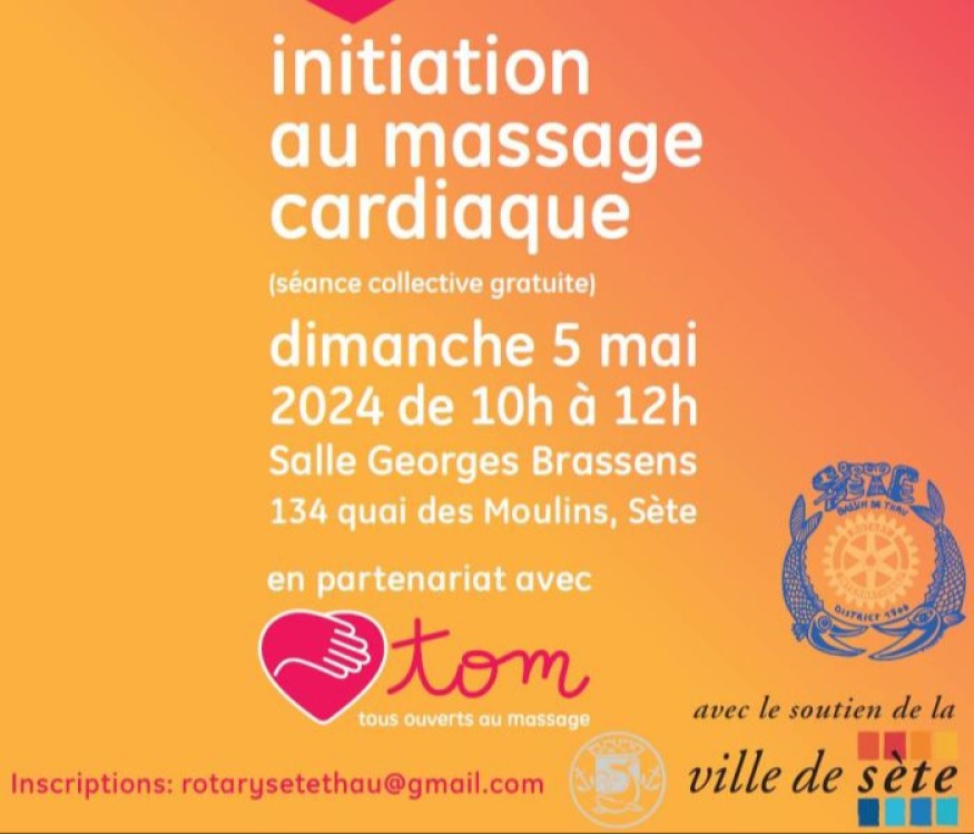 Le Rotary club Sète bassin de Thau, en partenariat avec l’association TOM et la Ville de Sète, organise une initiation au massage cardiaque et à l’utilisation du défibrilateur, dimanche 5 mai, de 10 h à midi, à la salle GeorgesBrassens.