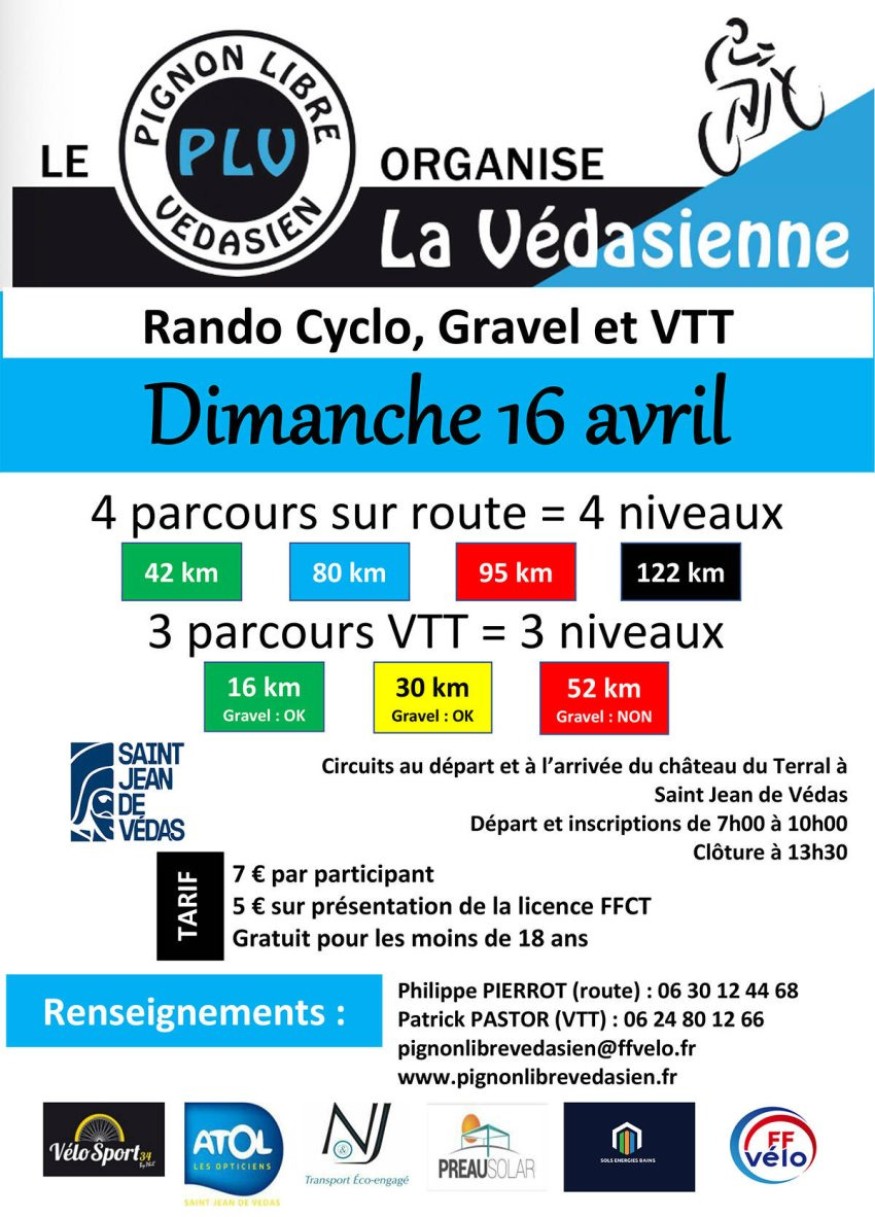 Le Pignon Libre Védasien est fier de vous annoncer sa prochaine course, la Védasienne, qui aura lieu le dimanche 16 avril au départ du Chai du Terral. Quatre randonnées cyclotouristes allant de 42 km à 122 km vous attendent durant toute la matinée :