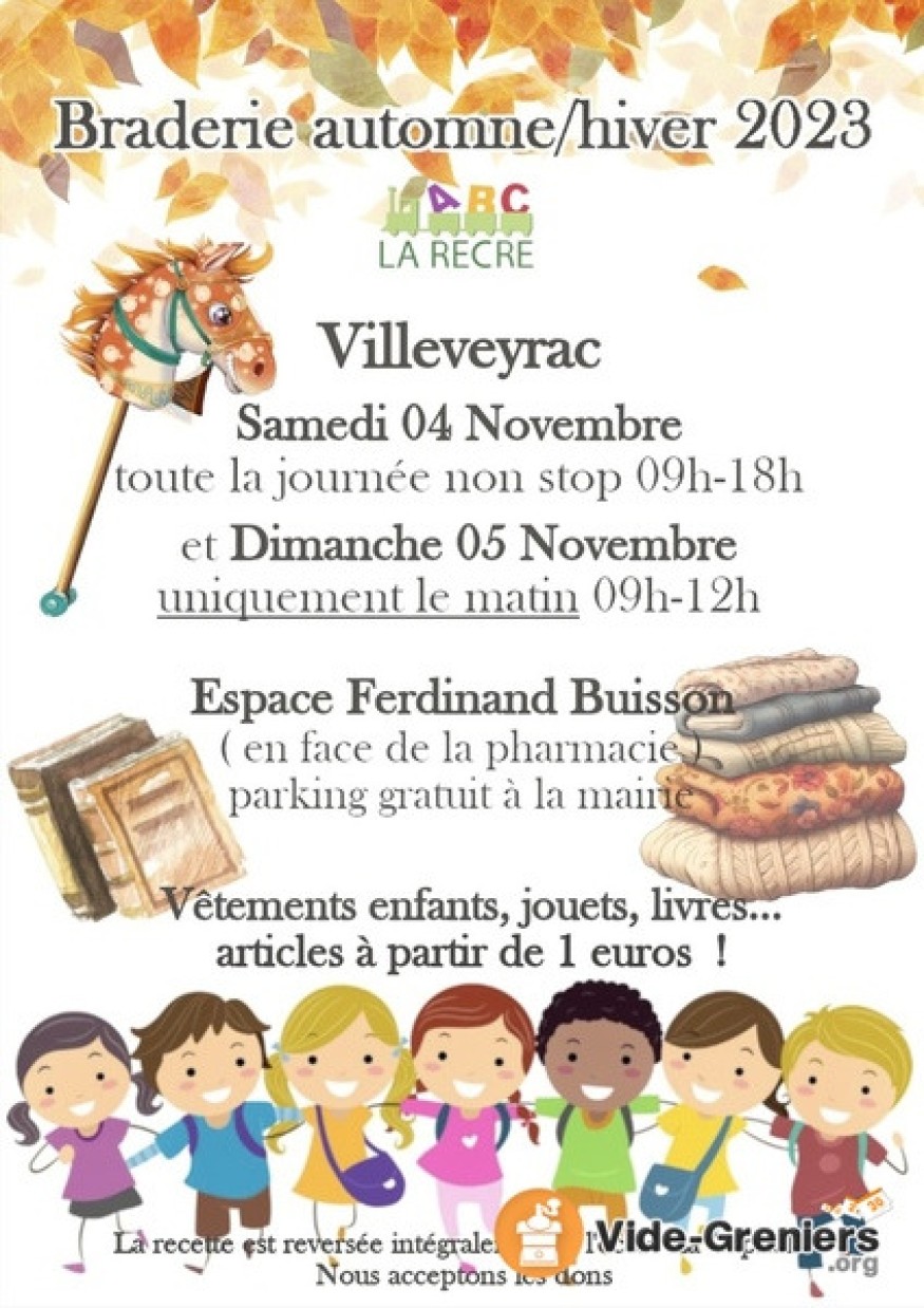 “La Récré” association de parents et grands-parents d’élèves des écoles de la Capitelle, organise samedi 4 novembre, de 9 h à 18 h et dimanche 5 novembre, de 9 h à 12 h, sa grande braderie d’automne. Elle se déroulera dans la salle du rez-de-chaussée et sous le préau de l’espace Ferdinand-Buisson (face à la pharmacie). Vêtements enfants, jouets et livres seront proposés à partir de 1 €.