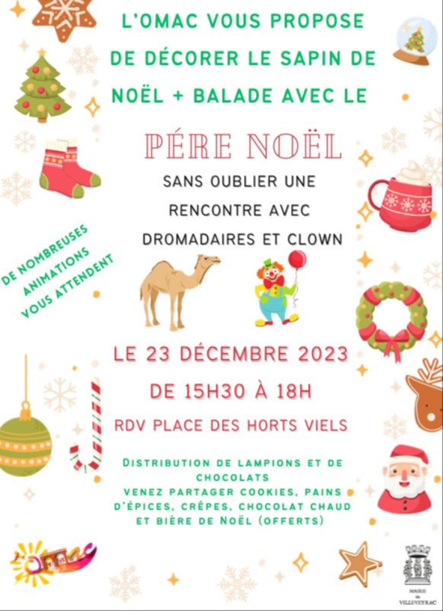 L’Omac (office municipal d’actions culturelles) propose de venir décorer le sapin de Noël le samedi 23 décembre, de 14 h 30 à 18 h, place des Horts Viels (devant la pharmacie). Sont annoncées une balade avec le Père Noël et la présence de dromadaires et d’un clown.